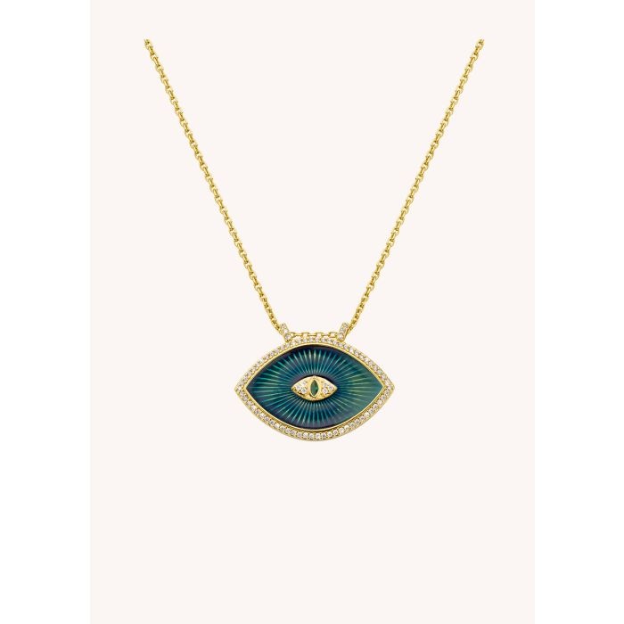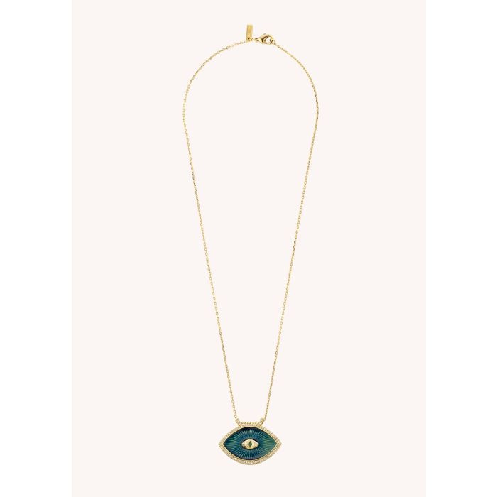 Discover our BLUE RAINBOW TIKA necklace with a design inspired by our TIKA necklace. Named after the ritual mark worn on the forehead in India that evokes the deep symbolism of this tradition. Borrowing its name from a good-luck practice, the necklace embodies mystical elegance while celebrating the cultural richness and positivity associated with its email in shades of blue and green inspired by the plumage of peacocks with an eye at its center, an emblematic symbol at MYA-BAY.