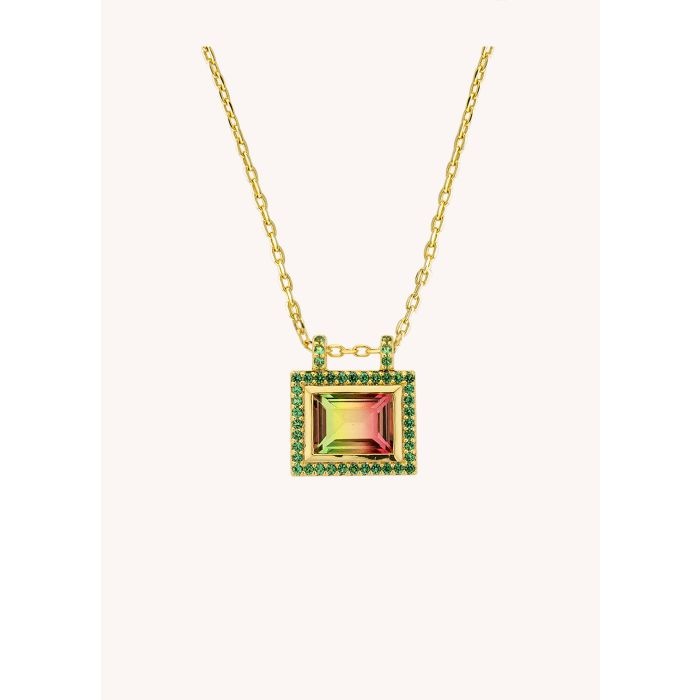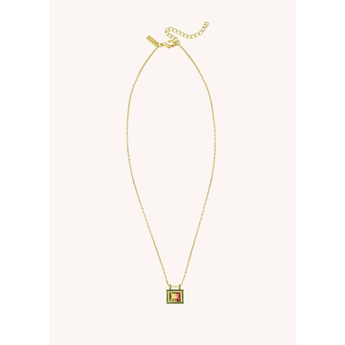The GREEN WATERMELON EL PASO necklace by MYA—BAY is gilded with 24-carat recycled fine gold. Its combination of intense green and watermelon pink stones creates a fresh and bright contrast, inspired by the warm colors of the Texas desert. It measures 38 cm + 5 cm of extra-chain, for an adjustable and lightweight fit.