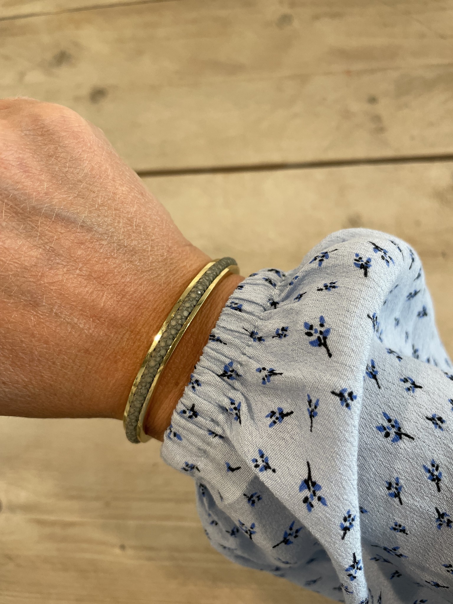 Exotic leather and gold plated metal called Saphira Bangle Basic Thin from the brand, Barong Barong. Lees meer