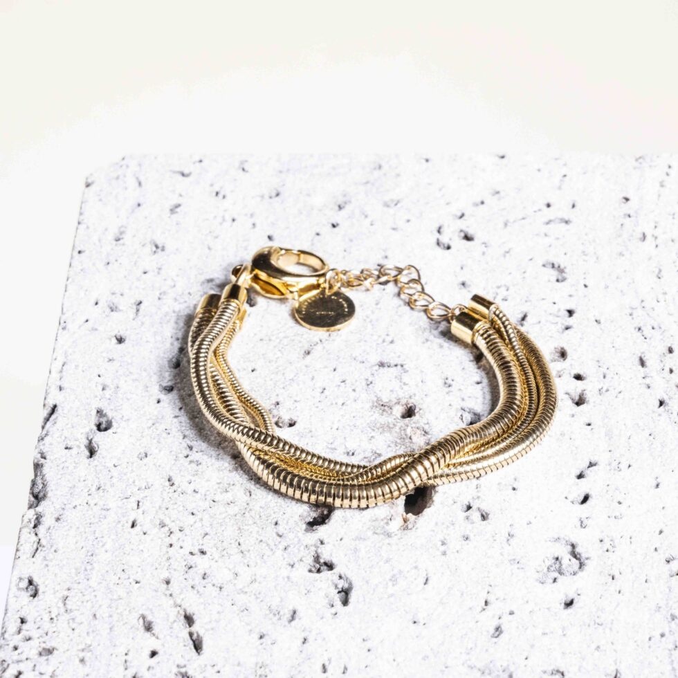 Omarm gedurfde elegantie met de Ophelia-collectie. Een armband versierd met strakke slangenkettingen, deze stukken zijn verkrijgbaar in 24-karaats verguld goud of palladium. Ontworpen voor degenen die het aandurven om op te vallen, voegen ze een vleugje felle verfijning toe aan elke look.